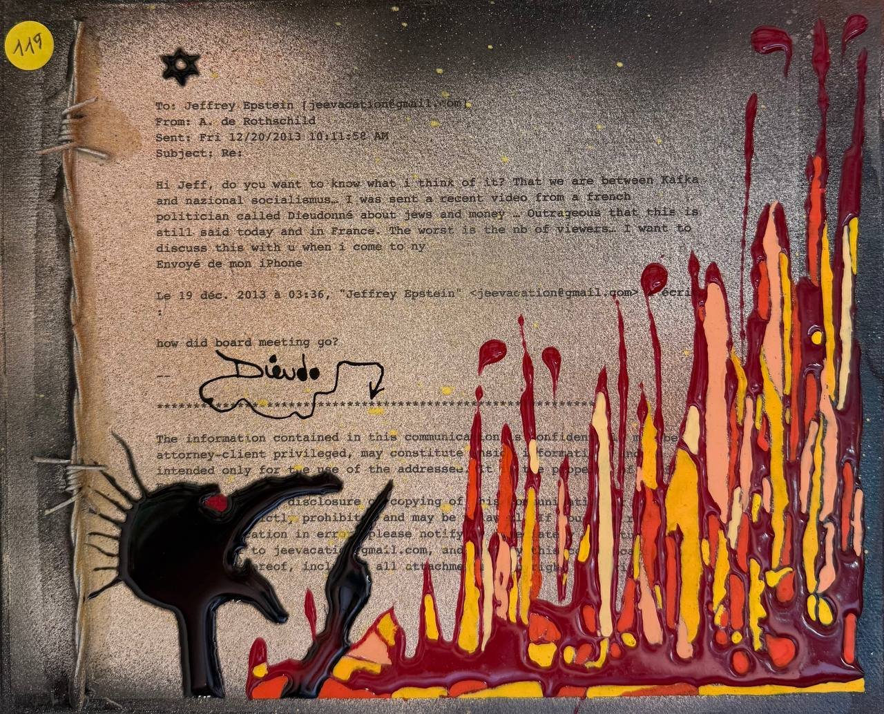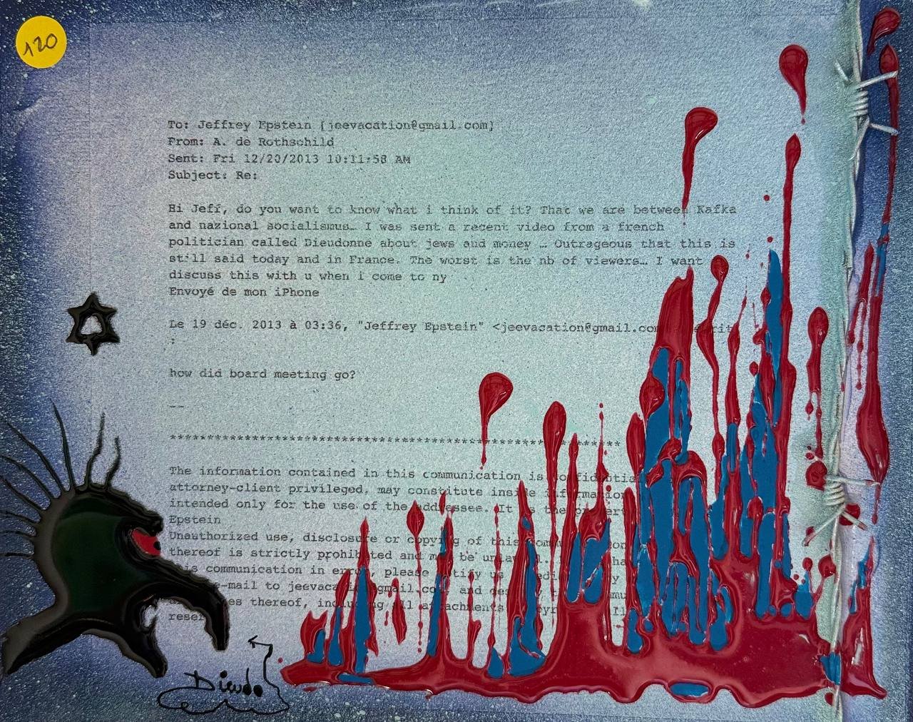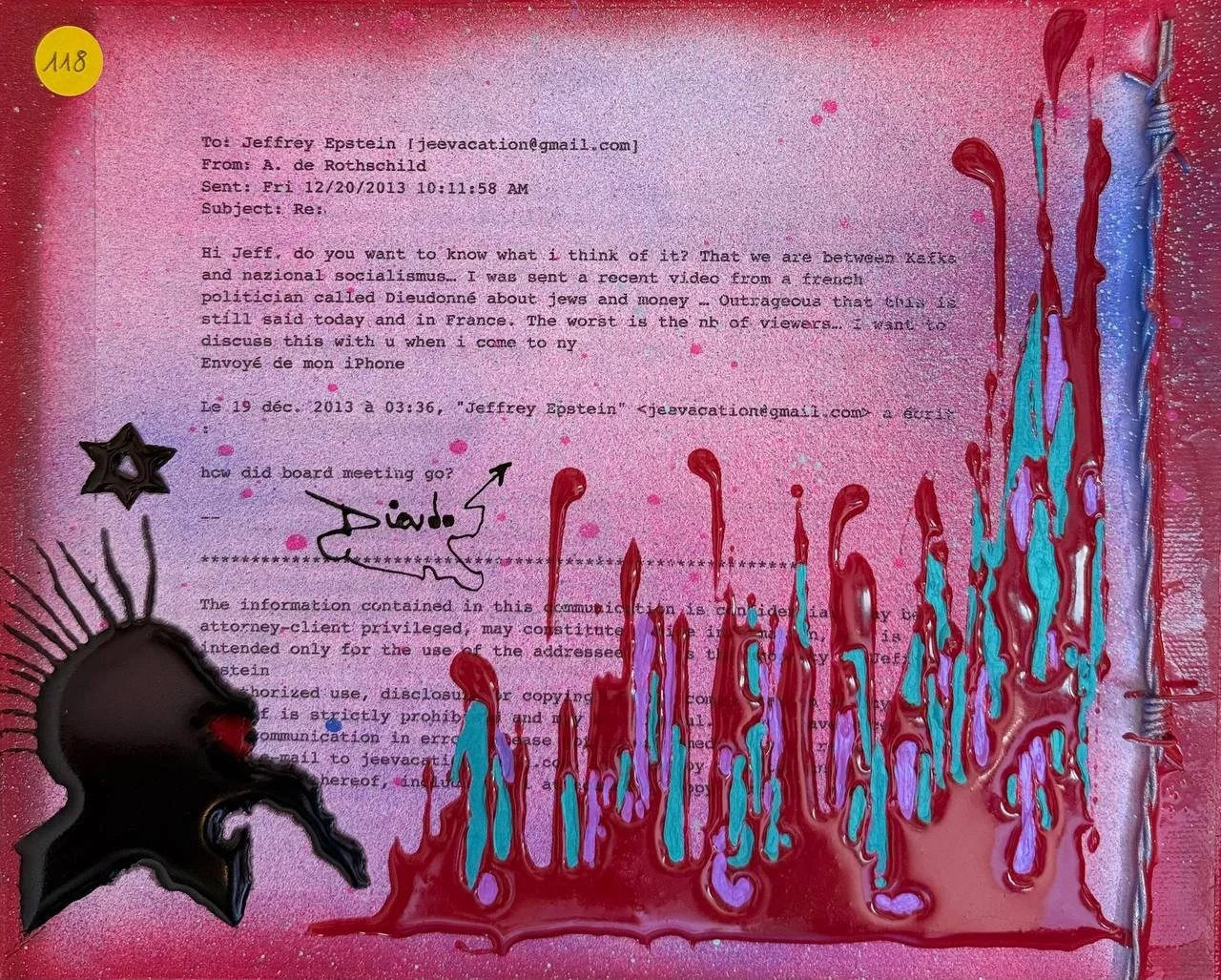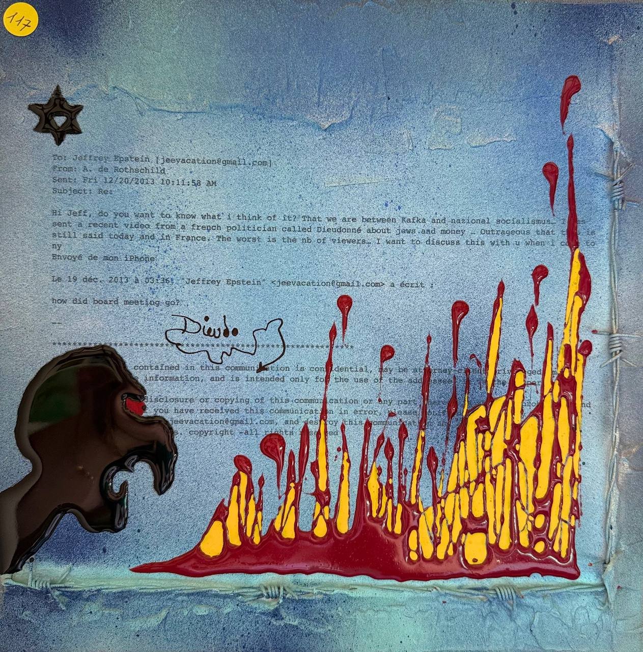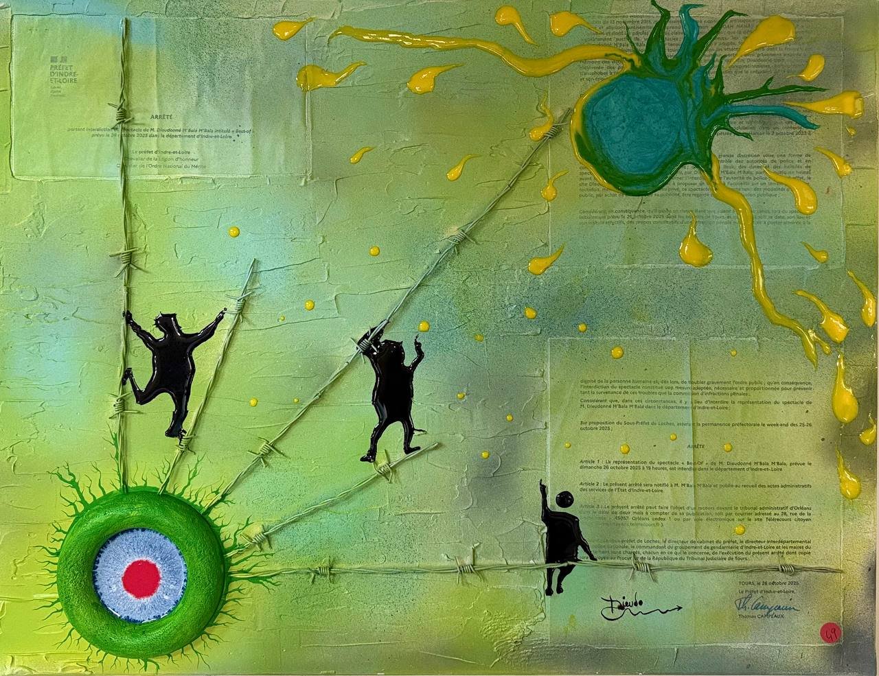 Technique mixte : peinture, matière, fil barbelé.